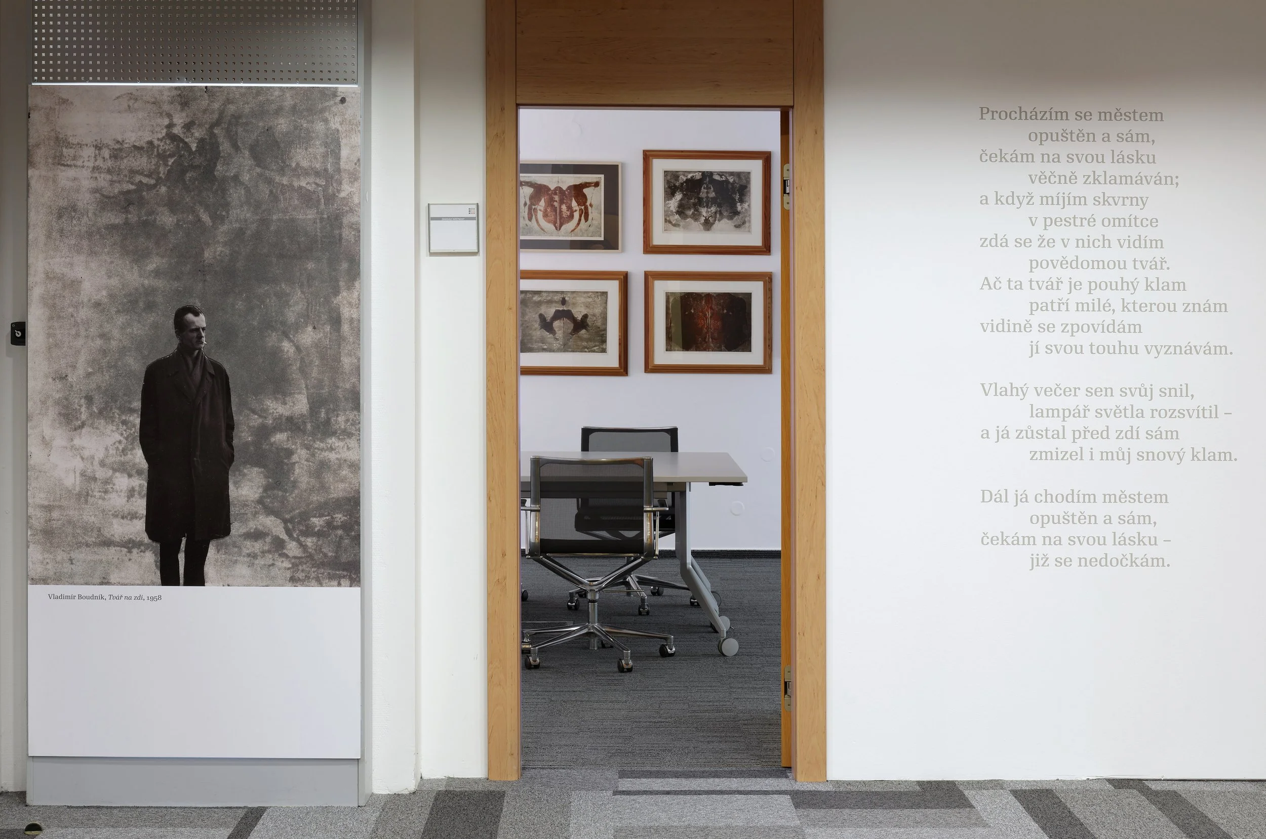 Tvář na zdi zajímavě propojila ve dvou navazujících výstavách dvě soukromé sbírky děl Vladimíra Boudníka, sbírku Miroslava Velfla a sbírku Jana Placáka. Pro výstavu vybrali díla, která spolu pozoruhodně úzce souvisí, a jejich společné vystavení velmi dobře ukazuje na klíčové přístupy Boudníka ke své vlastní tvorbě.